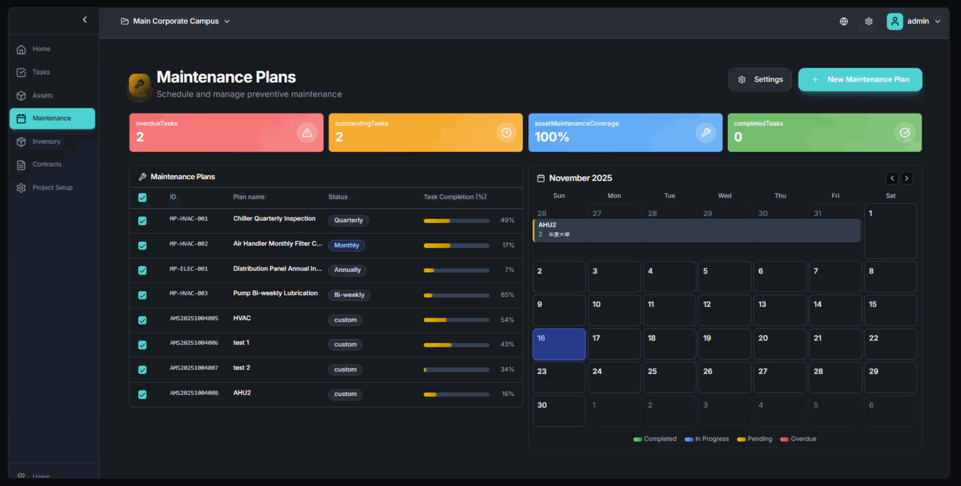 Calendar-based scheduling with color-coded status indicators. View November 2025 maintenance activities with completed, in-progress, pending, and overdue tasks.